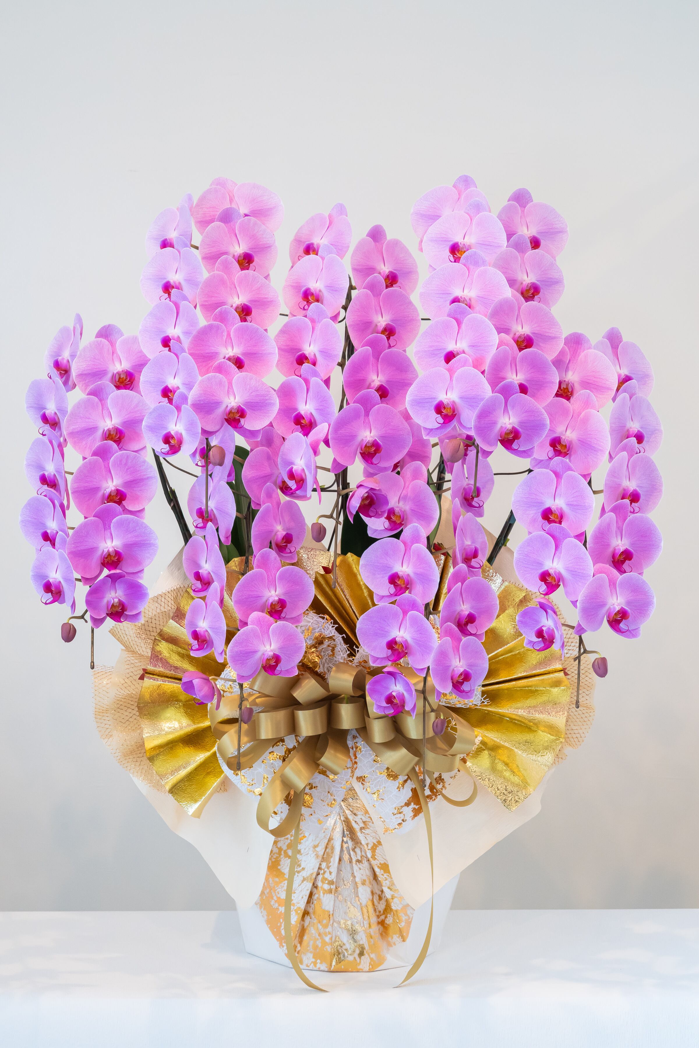 7本立ては見た瞬間にその場の注目浴びるようなボリュームがあります。ピンクの胡蝶蘭は、ひときわ存在感があり、お祝いのワンシーンを彩る華やかなカラーです。